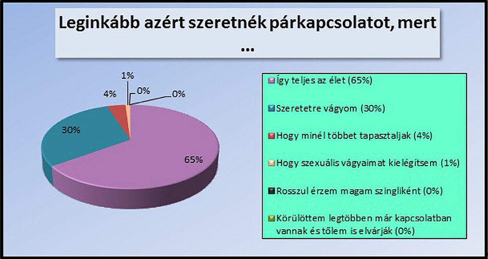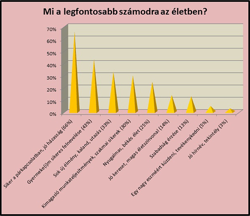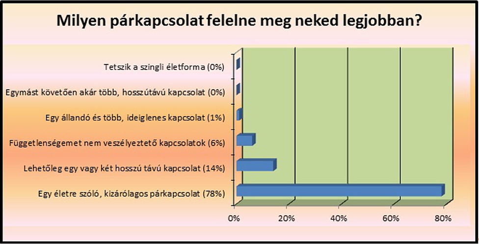 n környezetünk. A legtöbben ma is úgy gondoljátok, hogy azzal teljes az életetek, ha jó házasságban, illetve párkapcsolatban éltek, ami egy életre szól és kizárólagosságot von maga után (nem többpartnerűséget). Ezt a kapcsolatot a kölcsönös szerelem fűti. Egy olyan szerelem, aminek sosem alszik ki a lángja és a halálig elég itt a földön. De mi kell egy ilyen tűzhöz? Folyamatos izzásban tartás, amibe beletartozik az elfogadás, a megbecsülés. Gyakran a saját érdekeink háttérbe szorítása. Türelem, megértés, beszélgetés, egymás támogatása és bíztatása. Elkötelezettség a társunk és a közös céljaink felé. Őszinteség, meghittség, biztonság, fizikai vonzódás, némi személyes tér és bizalom. Ez csak pár eleme a képletnek, de meddig lehetne sorolni? Senki sem születik mindnek a birtokosaként, sokszor kemény leckék által tanuljuk meg igazán, mik is ezek. Csupán az nem mindegy, a helyes úton tesszük-e ezt, helyes értékrend alapján.2012 szeptemberét azzal indítottuk el, hogy kíváncsiak voltunk, Ti hogyan látjátok a világot magatok körül. Milyen mozgatórugóitok vannak az életben, gondoltok-e a jövőtökre, vannak-e terveitek és mik azok. Milyen értékrendre építkeztek. Több, mint 1000, 19 és 28 év közötti lány kérdőívét kaptuk vissza feldolgozásra ezekkel a kérdésekkel kapcsolatban, bővítve is a témakört. Lássuk az eredményeket!